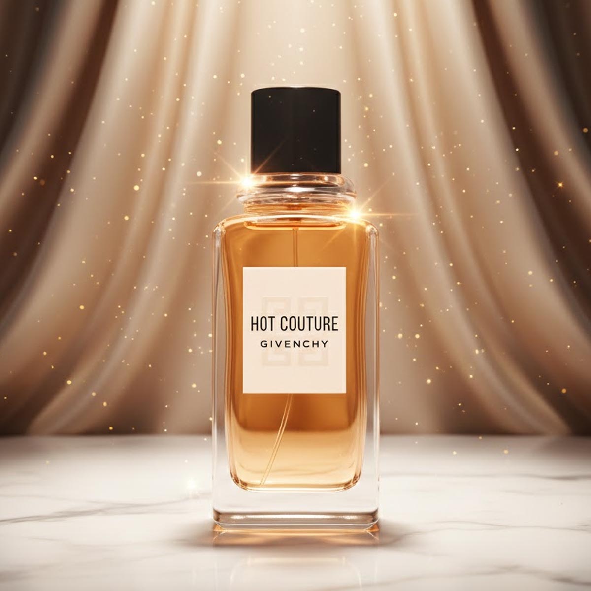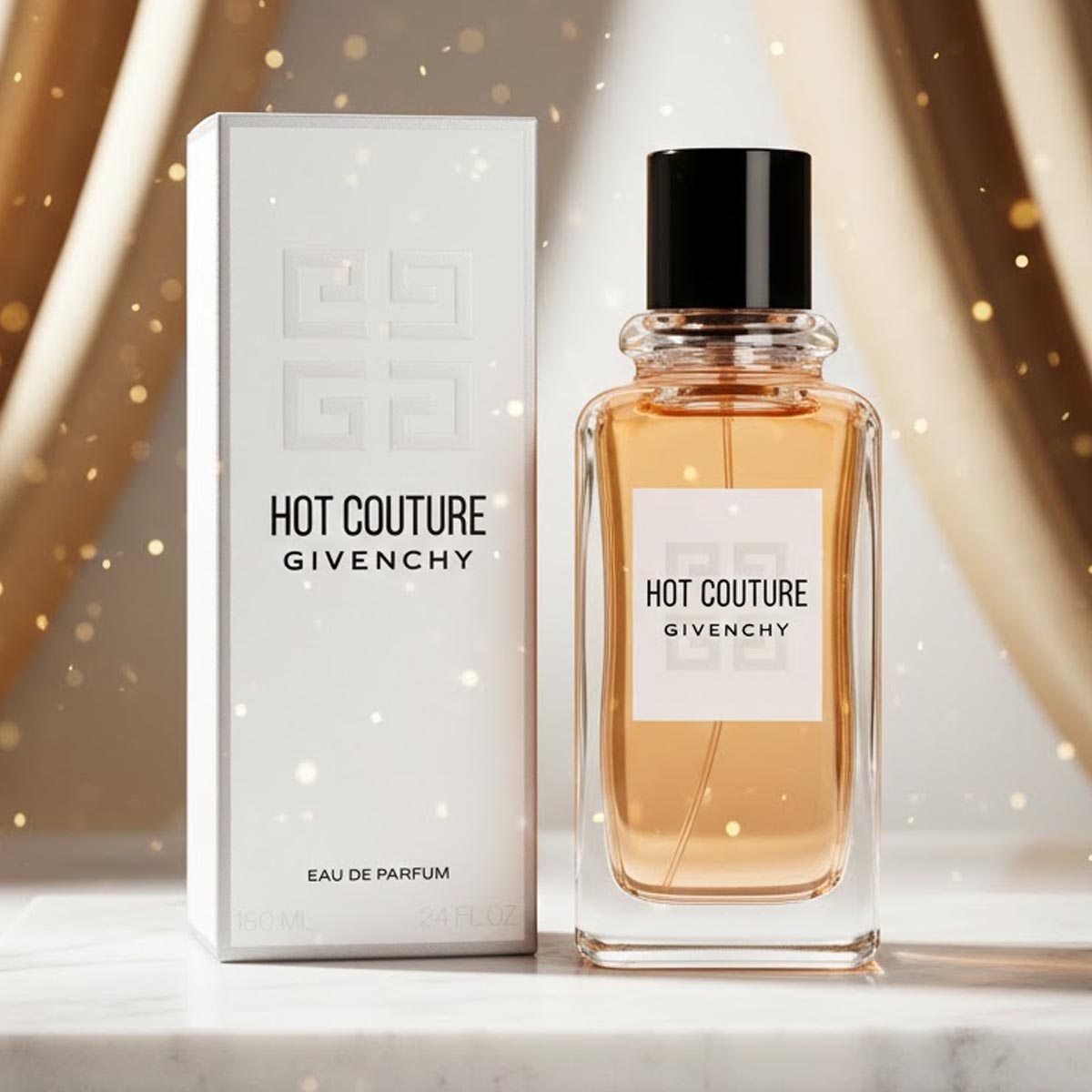 زجاجة شفافة أنيقة بسائل كهرماني وغطاء أسود فاخر، مع تغليف أبيض يحمل شعار Hot Couture بأسلوب كلاسيكي يعكس طابع العطر الراقي والجريء.