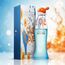 زجاجة مبتكرة بتصميم مرح وألوان زاهية، تعكس روح العطر المرحة، مع تغليف فني يحمل لمسات من اللون البرتقالي والأزرق بأسلوب فني فريد.