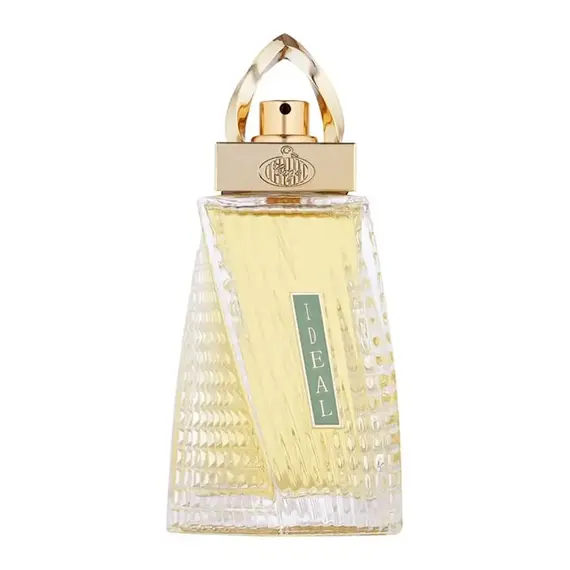 يتميز التصميم بزجاجة مثلثة (هرمية) ذات ملمس متباين؛ حيث تزين الجوانب نقوش بارزة تشبه الماس، بينما يأتي المنتصف بتموجات انسيابية، يتوسطها شعار "IDEAL" على خلفية خضراء راقية. يتوج الزجاجة غطاء ذهبي مبتكر على شكل حلقة مقوسة، يضفي لمسة من الفخامة ويسهل حمل العطر بأناقة.