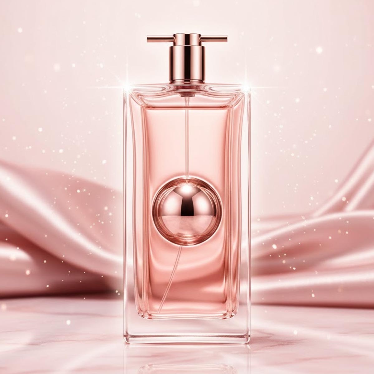 زجاجة مسطحة أنيقة بلون وردي ذهبي معدني، مع تصميم كروي في المنتصف يرمز إلى الطاقة الداخلية، وتغليف وردي ناعم يحمل توقيع Lancôme بأسلوب عصري فاخر.