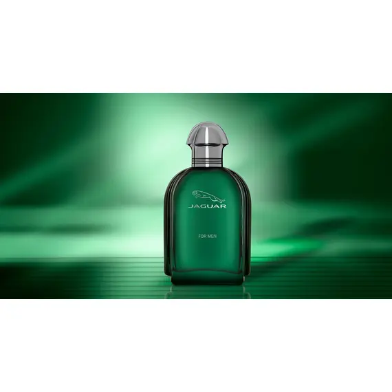 زجاجة خضراء داكنة أنيقة بغطاء فضي لامع، تحمل شعار النمر القافز، وتغليف فاخر يعكس هوية Jaguar الكلاسيكية والراقية.