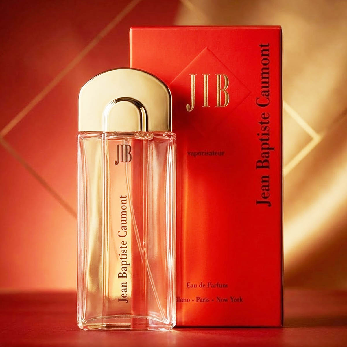 زجاجة شفافة أنيقة بغطاء ذهبي ولمسات فاخرة، وتغليف أحمر يحمل توقيع JBC بأسلوب عالمي يجمع بين ميلانو وباريس ونيويورك – يعكس الفخامة والتميز.
