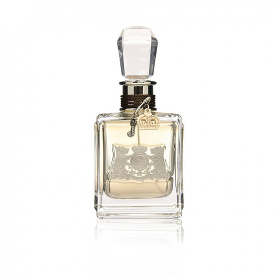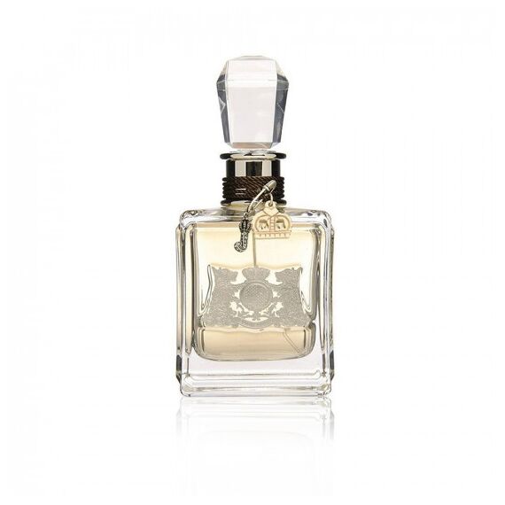 زجاجة شفافة أنيقة تحتوي على سائل ذهبي فاخر، مزينة بشعار Juicy Couture الملكي وغطاء كريستالي فاخر يعكس روح العطر الراقية.