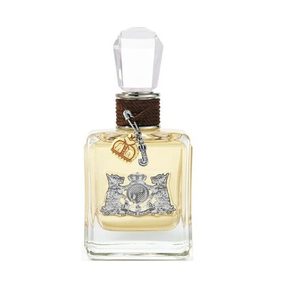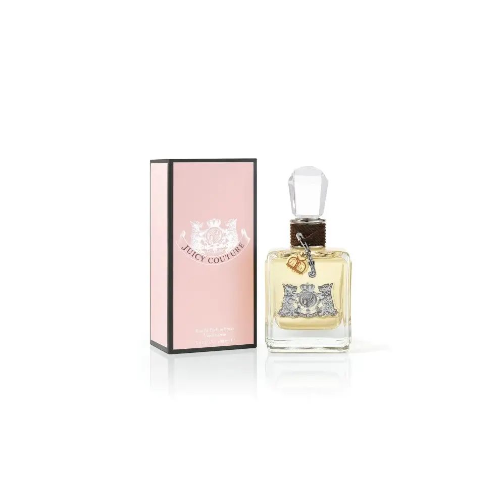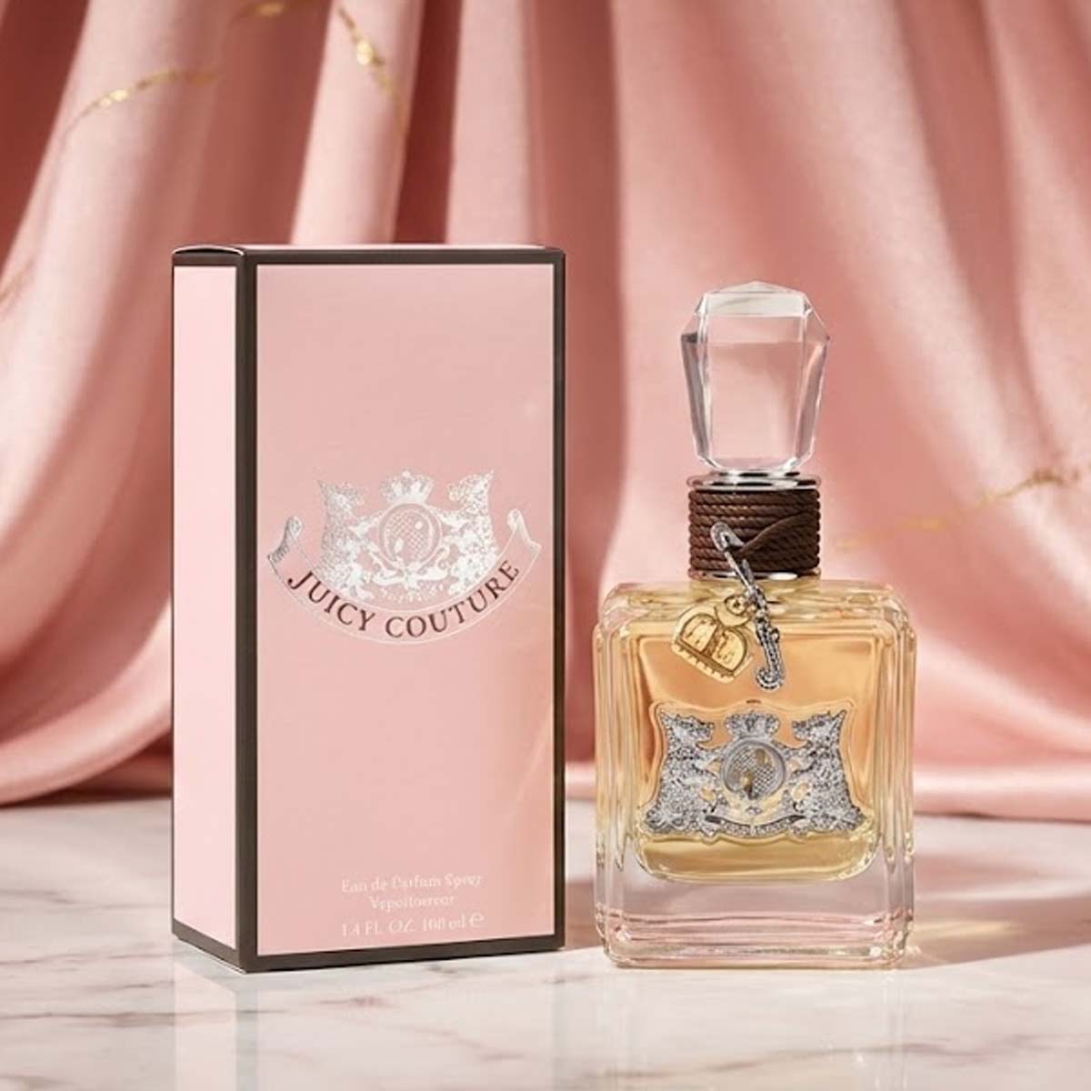 زجاجة شفافة أنيقة تحتوي على سائل ذهبي فاخر، مزينة بشعار Juicy Couture الملكي وسلسلة ذهبية أنيقة، مع غطاء كريستالي فاخر يعكس روح العطر الراقية.