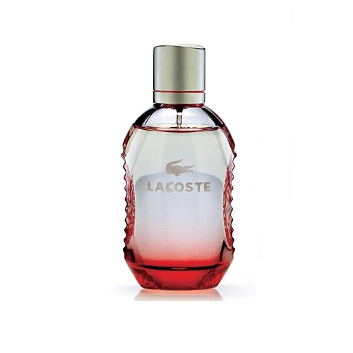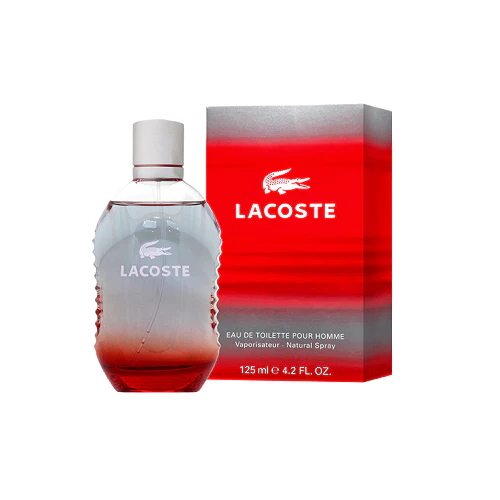 تغليف أنيق بتدرجات الأحمر والرمادي يحمل شعار Lacoste الشهير، يعكس الطابع العصري والرياضي للعطر.