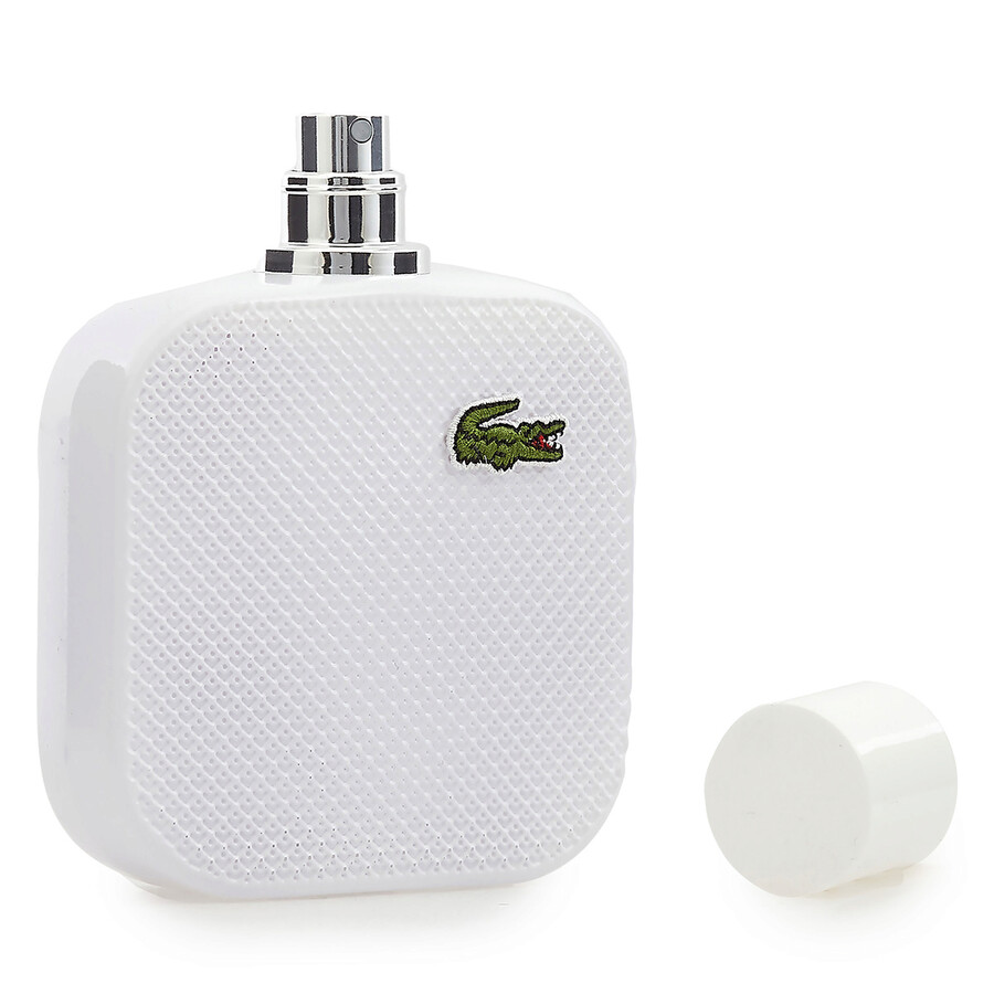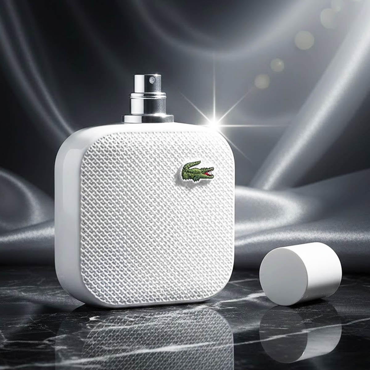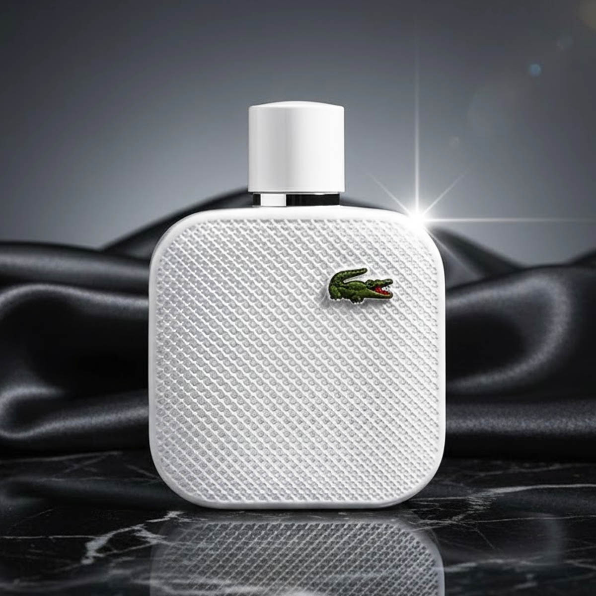 زجاجة بيضاء أنيقة تحمل شعار التمساح الكلاسيكي، بتصميم مستوحى من قميص Lacoste الأبيض، وتغليف أبيض بسيط يعكس روح العطر النقية والعصرية.