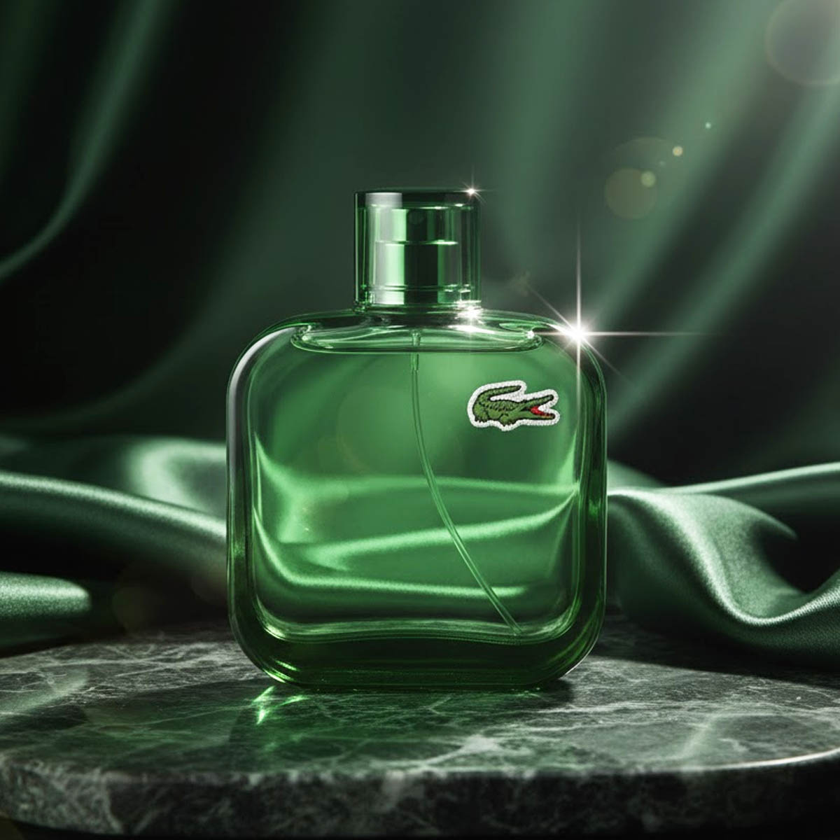 زجاجة خضراء أنيقة بتصميم مستوحى من قمصان Lacoste الشهيرة، تحمل شعار التمساح الكلاسيكي، وتغليف أخضر أنيق يعكس روح العطر الطبيعية والمنعشة.