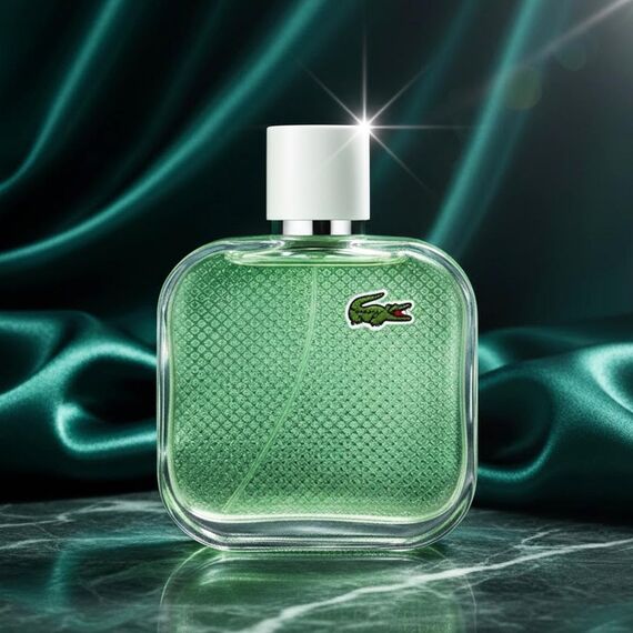 زجاجة خضراء أنيقة بتصميم مستوحى من قمصان Lacoste الشهيرة، تحمل شعار التمساح الكلاسيكي، وتغليف أخضر أنيق يعكس روح العطر الطبيعية والمنعشة.