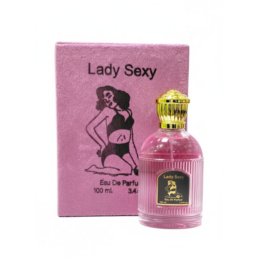 عطر "ليدي سكسي" يُروّج له بأنه أو دو بارفان أنثوي بتركيبة جذابة، ويأتي في عبوة وردية مزخرفة مع رسمة أنثوية جريئة، مما يعكس طابعًا جريئًا ومغريًا.