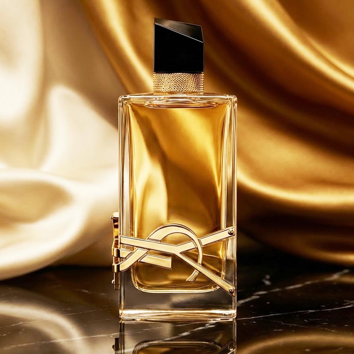 زجاجة شفافة أنيقة بسائل ذهبي، مزينة بشعار YSL الذهبي الملتف حول الزجاجة وغطاء أسود غير متماثل، مع تغليف فاخر يعكس روح العطر الجريئة.
