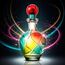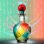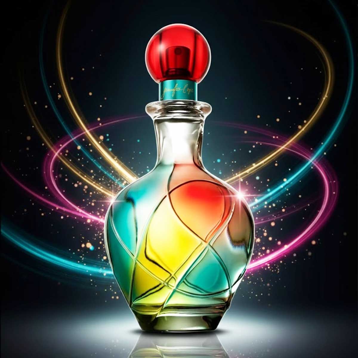 زجاجة فنية متعددة الألوان بتدرجات الأزرق والأحمر والأصفر، مع غطاء كروي أحمر، داخل تغليف أزرق لامع يعكس طابع العطر الحيوي والفخم.