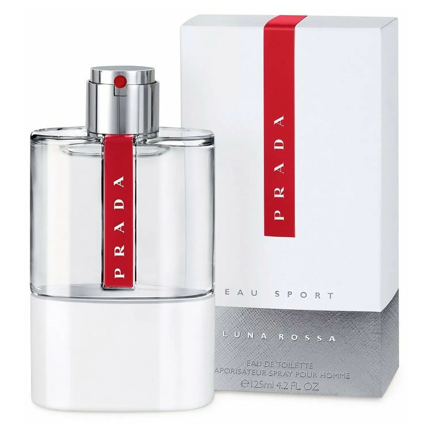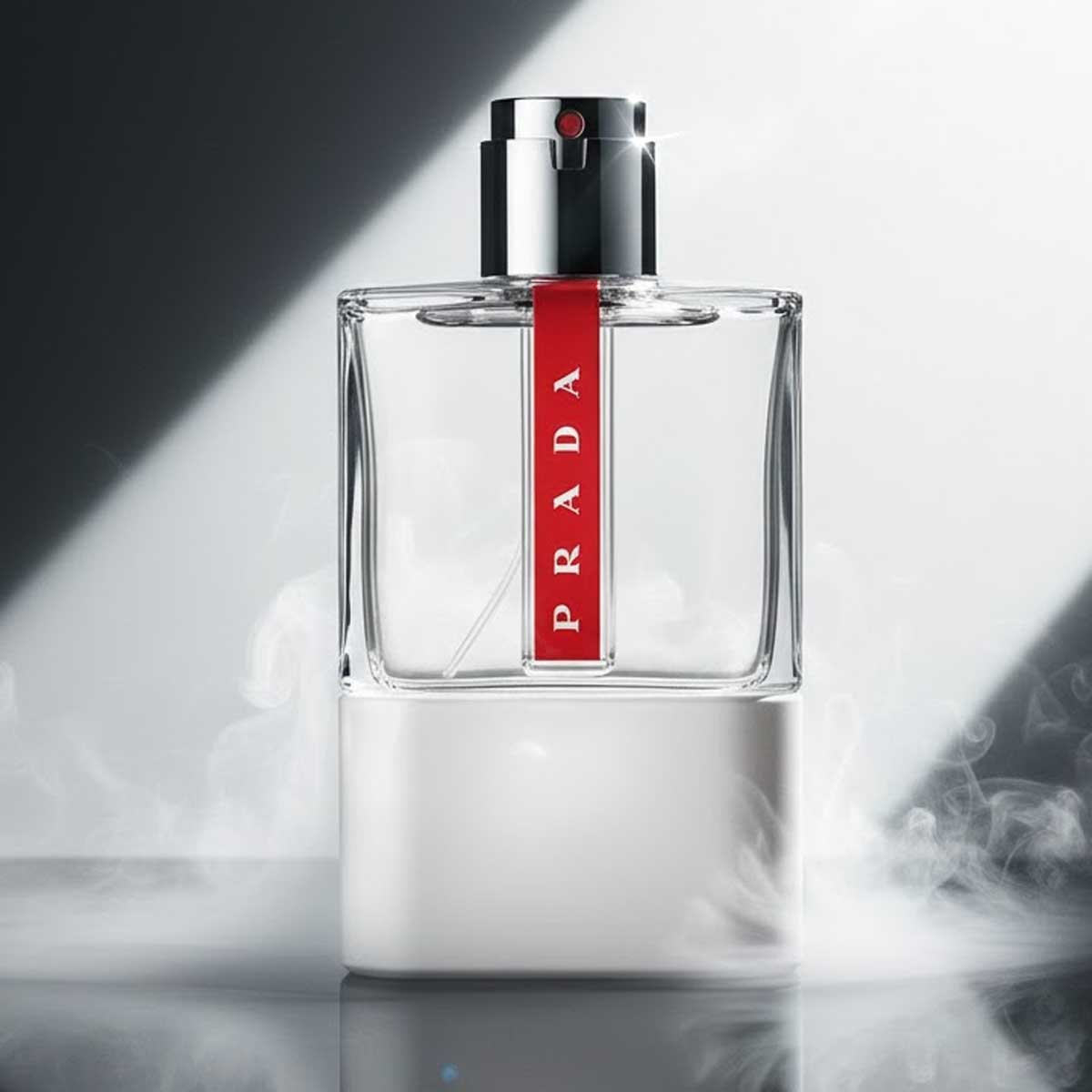 زجاجة أنيقة بتصميم عصري يجمع بين الشفافية والقاعدة البيضاء، مزينة بشريط أحمر يحمل توقيع PRADA، داخل تغليف أبيض وفضي فاخر يعكس طابع العطر الديناميكي والرياضي.
