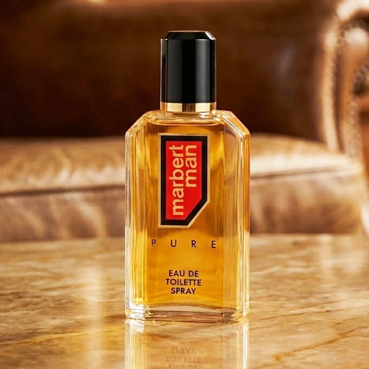 زجاجة شفافة بسائل أصفر وغطاء أسود أنيق، مع تصميم عصري يحمل توقيع Marbert Man بأسلوب جريء.