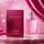 زجاجة شفافة أنيقة تحتوي على سائل وردي فاتح، مع غطاء فضي أنيق وتغليف وردي معدني يعكس طابع العطر المشرق.