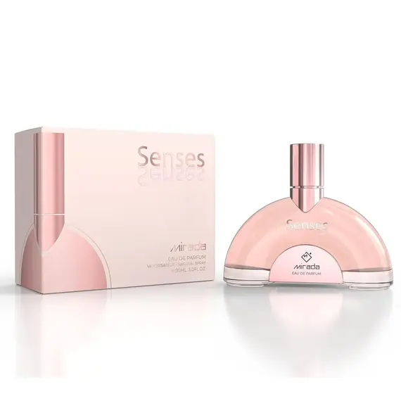 أيقظي مشاعرك واستمتعي بلحظات من الهدوء والرومانسية مع عطر ميرادا سينسز (Mirada Senses). يأتي هذا العطر ليخاطب حواسك بلمسة من الرقة المتناهية، في زجاجة بتصميم "نصف دائري" (Arc Shape) بلون وردي "خوخي" ناعم (Soft Peach)، تتوجها تفاصيل باللون الذهبي الوردي (Rose Gold)، لتعكس أنوثة عصرية وهادئة.