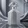 زجاجة فضية معدنية بتصميم كلاسيكي فاخر وغطاء على شكل زهرة منحوتة، وتغليف أنيق يجمع بين الذهبي والنقوش الفنية – يعكس الطابع الملكي للعطر.