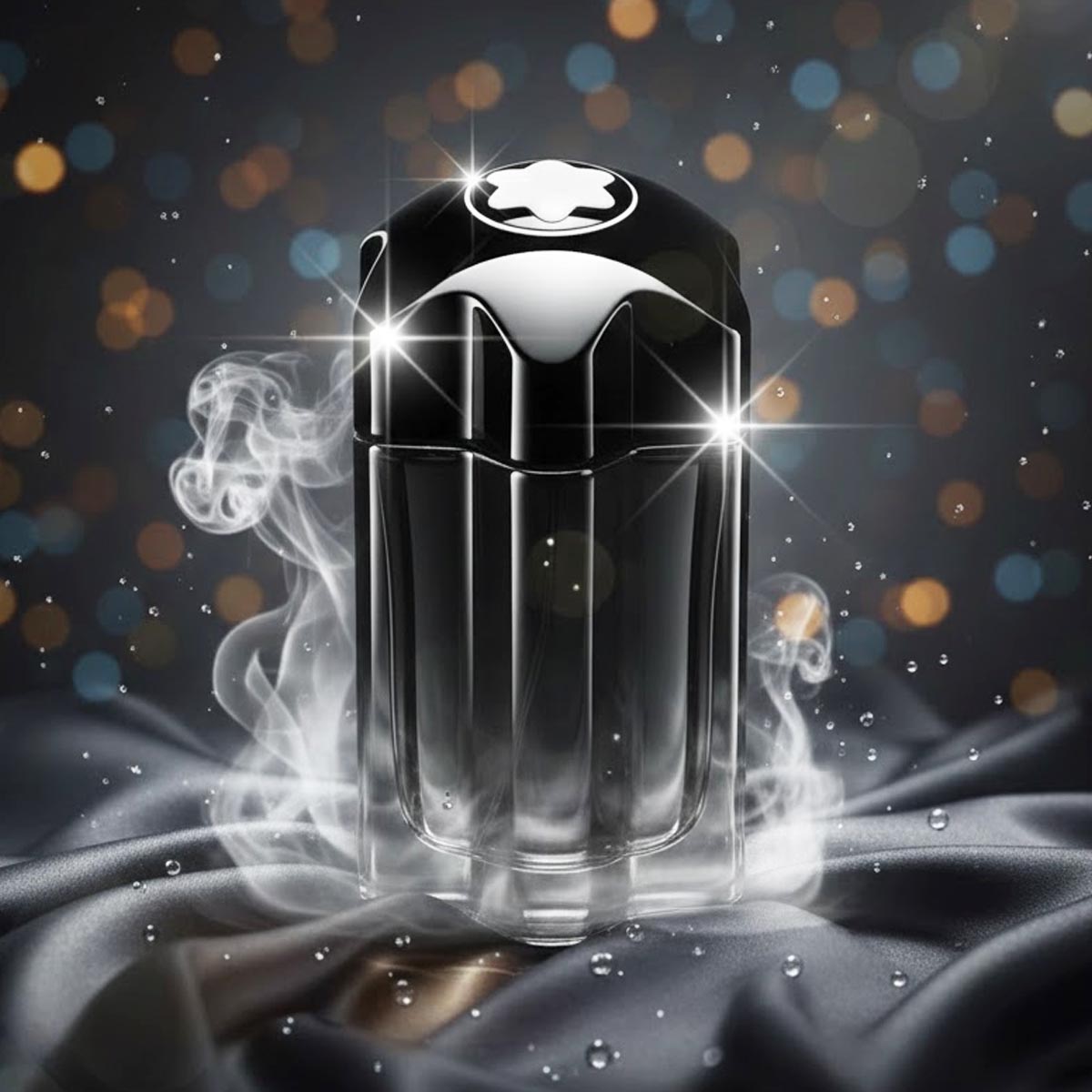 زجاجة سوداء أنيقة بتصميم منحوت يشبه شعار Mont Blanc، مع تغليف فاخر يحمل صورة رجل أنيق يعكس روح العطر الواثقة.