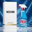 زجاجة مبتكرة بلون أزرق وتصميم يشبه عبوة منظف منزلي، مع تغليف أبيض أنيق يحمل شعار Moschino بأسلوب مرح وفاخر.