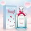 زجاجة شفافة تحتوي على سائل أزرق فاتح، مزينة بغطاء فضي على شكل قلب وشريطة وردية مرحة، مع تغليف أنيق يحمل قلوبًا صغيرة تعكس روح العطر المرحة والرومانسية.