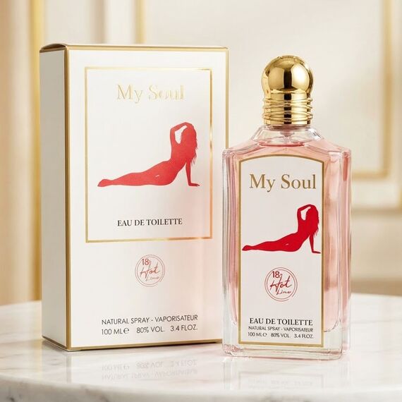 عطر "ماي سول" من سلسلة 18+ Hot Line يُروّج له بأنه أو دو تواليت جريء للبالغين، بتصميم أنيق يجمع بين اللون الأحمر والذهبي. الزجاجة الشفافة تحتوي على سائل عطري، وتُغلق بغطاء ذهبي فاخر، بينما تُبرز العبوة رسمة أنثوية مستلقية تعكس الطابع الحسي للعطر.