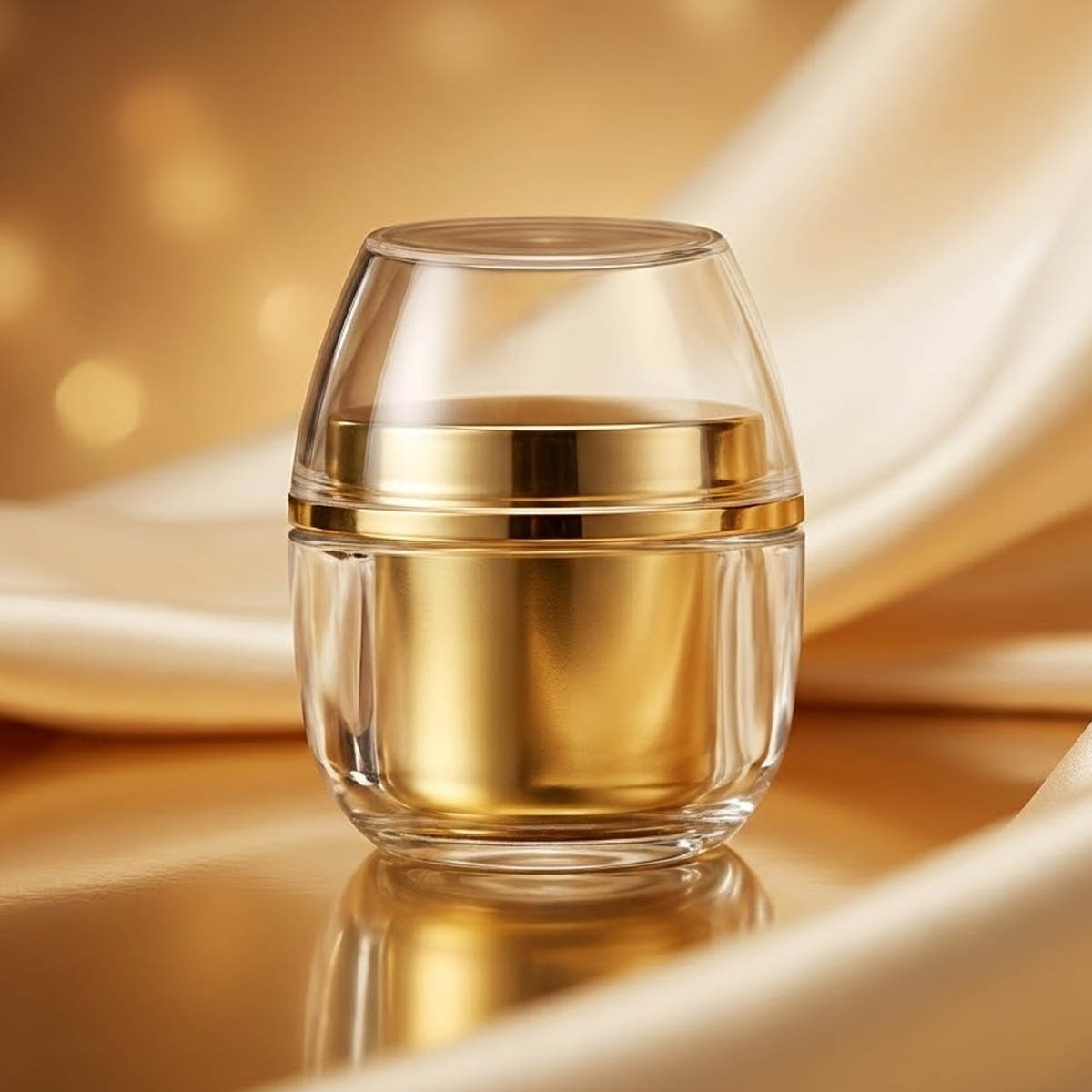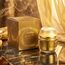 علبة ذهبية أنيقة مزينة بنقوش دائرية فنية، مع عبوة داخلية شفافة تحمل المنتج بلونه الذهبي – يعكس الفخامة والتميز.