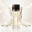زجاجة مستطيلة أنيقة بسائل بلون ذهبي فاتح وغطاء أسود فاخر، وتغليف أبيض مزخرف بنقوش فضية – يعكس الفخامة والرقي الكلاسيكي.