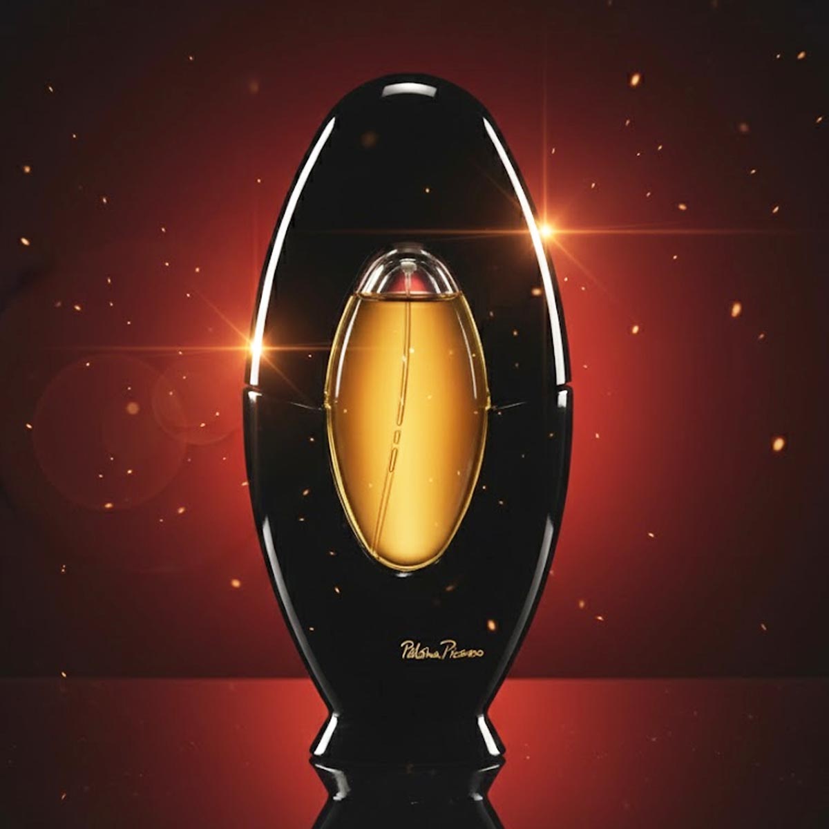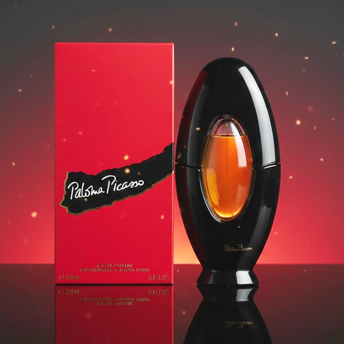 زجاجة سوداء أنيقة بتصميم بيضاوي مع نافذة شفافة تكشف السائل الذهبي، وتغليف أحمر فاخر يحمل توقيع Paloma Picasso بأسلوب فني مميز.