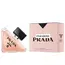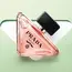 زجاجة مثلثة الشكل بانحناءات أنيقة تحتوي على سائل خوخي، مزينة بغطاء أسود يحمل شعار PRADA MILANO، داخل تغليف وردي فاخر يحمل مثلث أسود يعكس هوية العطر الجريئة والمعاصرة.