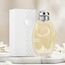 زجاجة شفافة أنيقة بسائل ذهبي فاتح وغطاء فضي، وتغليف أبيض مزين بنجوم فضية وقاطع نجمي يكشف جزءًا من الزجاجة – يعكس الطابع العصري والراقي للعطر.
