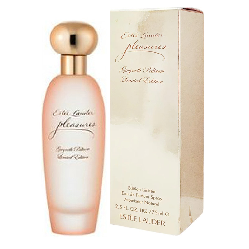 زجاجة وردية ناعمة بغطاء ذهبي أنيق، مع تغليف بلون كريمي يحمل شعار Pleasures بإطلالة فاخرة.