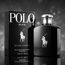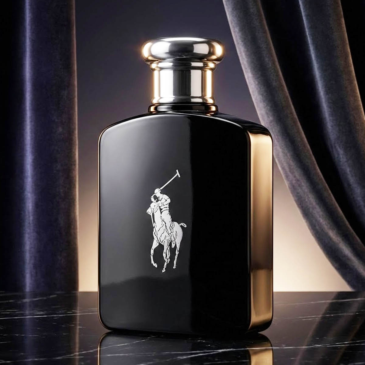 زجاجة سوداء أنيقة بغطاء فضي، مزينة بشعار لاعب البولو الفضي، وتغليف فاخر يعكس الطابع الرجولي العصري للعطر.