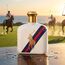 زجاجة بيضاء أنيقة مزينة بشريط قطري أحمر وكحلي وشعار لاعب البولو الذهبي، مع تغليف فاخر يعكس الطابع الرياضي الراقي للعطر.