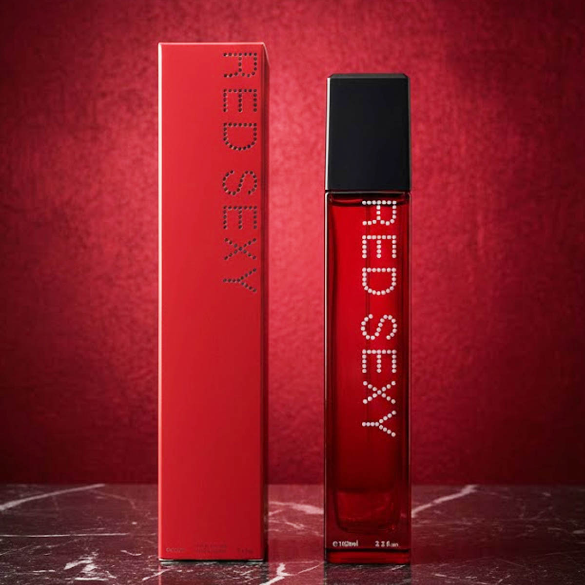 زجاجة حمراء مستطيلة أنيقة بغطاء أسود، تحمل عبارة “RED SEXY” بنمط نقطي عمودي، داخل تغليف فاخر بنفس التصميم يعكس طابع العطر الجريء والمغري.