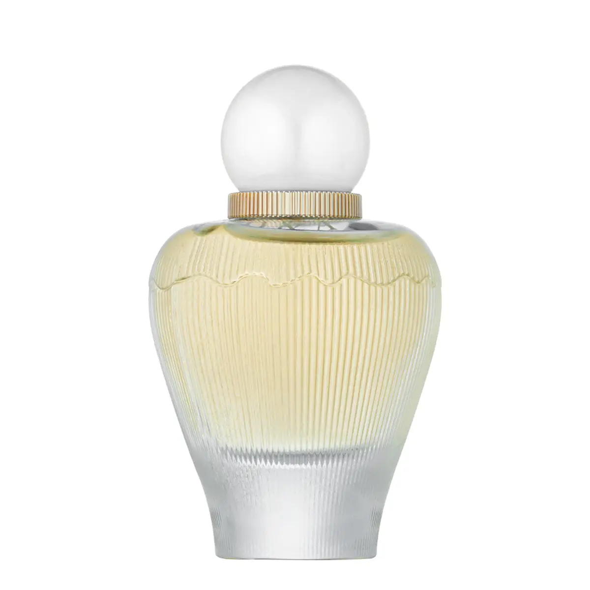 يتميز تصميم العطر بزجاجة شفافة ذات ملمس مضلع (خطوط طولية بارزة) تمنحها طابعاً كلاسيكياً عصرياً، وتكشف عن لون العطر الذهبي بداخلها. يتوج الزجاجة غطاء كروي أبيض ناعم يشبه اللؤلؤة الكبيرة، يرتكز على عنق ذهبي لامع، مما يضفي لمسة من الفخامة والرقي على طاولة زينتك.
