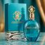 زجاجة بلون فيروزي أنيق مع غطاء ذهبي مزخرف يحمل شعار RC، وتغليف فاخر مزين بنقشة جلد الحمار الوحشي يعكس طابع Cavalli الجريء والمنعش.