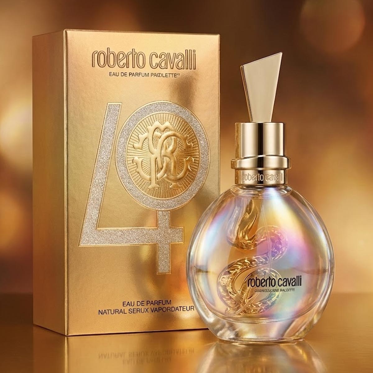 زجاجة بيضاوية أنيقة تحتوي على سائل كهرماني، مزينة بغطاء ذهبي فاخر يحمل شعار Cavalli، وتغليف ذهبي مزين برمز احتفالي مميز يعكس طابع العطر الملكي والفخم.