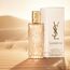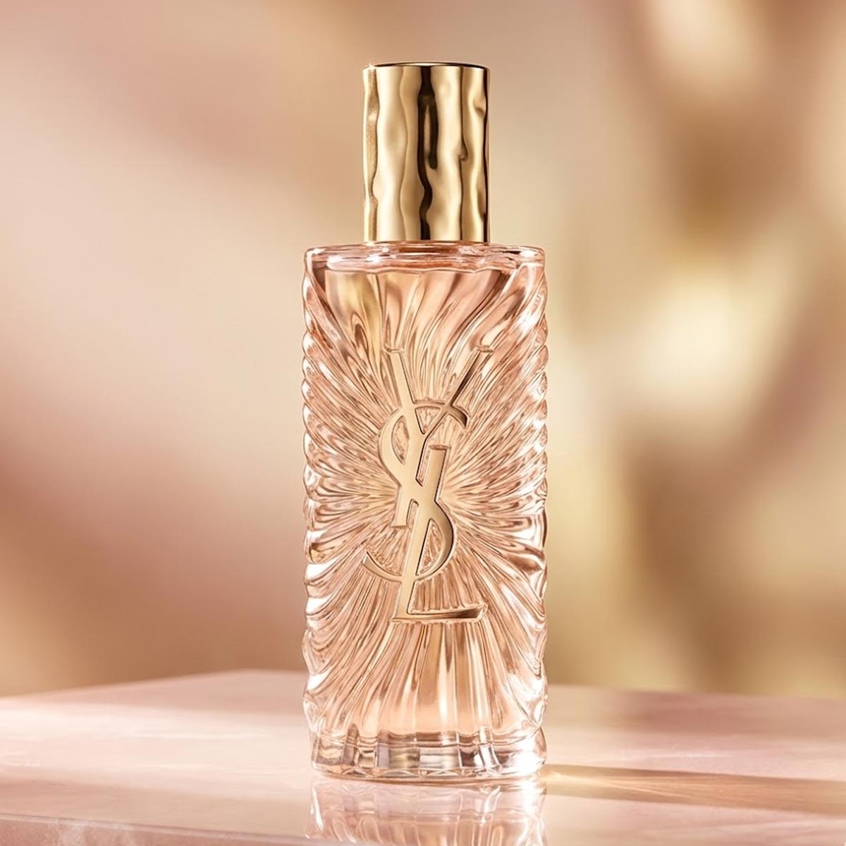 زجاجة فاخرة بنقوش شمسية بارزة وشعار YSL محفور في المنتصف، مع غطاء ذهبي أنيق وتغليف أبيض يعكس النقاء والانتعاش.