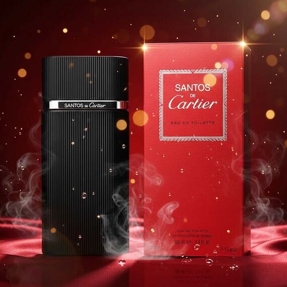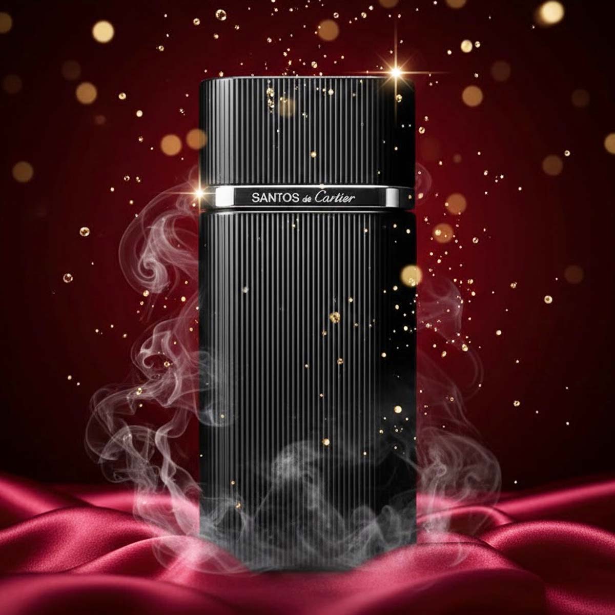 زجاجة سوداء مضلعة أنيقة مع شريط فضي يحمل شعار Santos de Cartier، وتغليف أحمر ملكي يعكس هوية Cartier الفاخرة.
