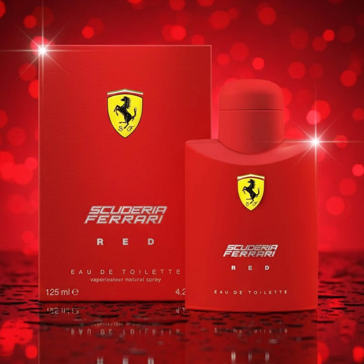 زجاجة حمراء أنيقة تحمل شعار الحصان الشهير، مع غطاء فضي أنيق، وتغليف يجمع بين الأحمر والفضي يعكس هوية Ferrari الرياضية والفاخرة.