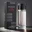 زجاجة أسطوانية أنيقة تحتوي على سائل بنفسجي فاتح، بغطاء أسود مزين بخطوط فضية أفقية، داخل تغليف أسود فاخر يحمل اسم العطر باللون الأحمر، يعكس طابع العطر الجريء والعصري.