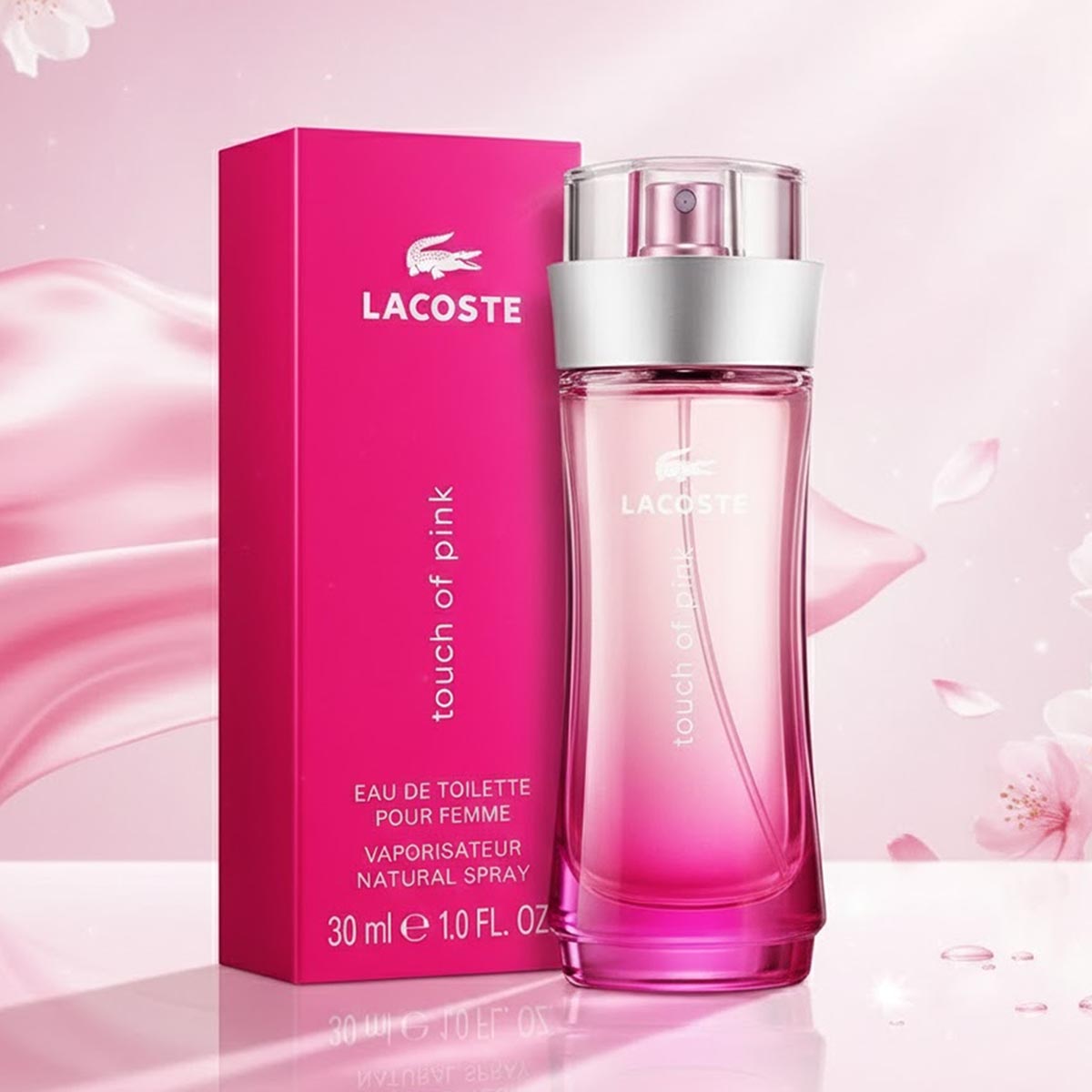 زجاجة أنيقة بتدرج وردي جذاب مع غطاء فضي بلمسة وردية، وتغليف وردي يعكس روح العطر المرحة والحيوية.