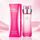 زجاجة أنيقة بتدرج وردي جذاب مع غطاء فضي بلمسة وردية، وتغليف وردي يعكس روح العطر المرحة والحيوية.