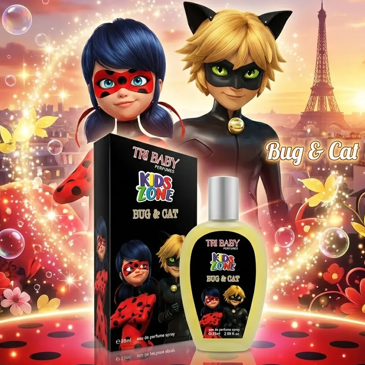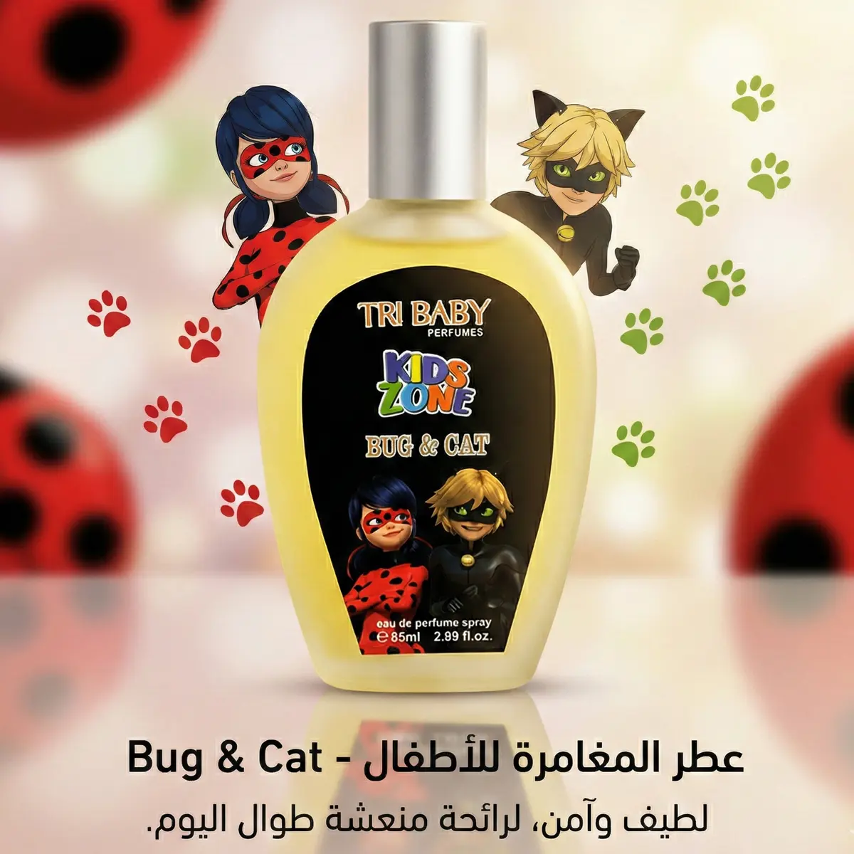 اجعل أطفالك يعيشون أجواء المغامرات والبطولة في شوارع باريس مع عطر Bug & Cat من مجموعة Tri Baby Perfumes. عطر "كيدز زون" مصمم خصيصاً للأطفال، يجمع بين الانتعاش والمرح بصحبة شخصياتهم المفضلة "الدعسوقة والقط الأسود" (Ladybug & Cat Noir).