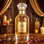 زجاجة شفافة أنيقة بسائل ذهبي وغطاء ذهبي فاخر، وتغليف أسطواني أسود بلمسات ذهبية – يعكس الطابع الملكي والشرقي للعطر.