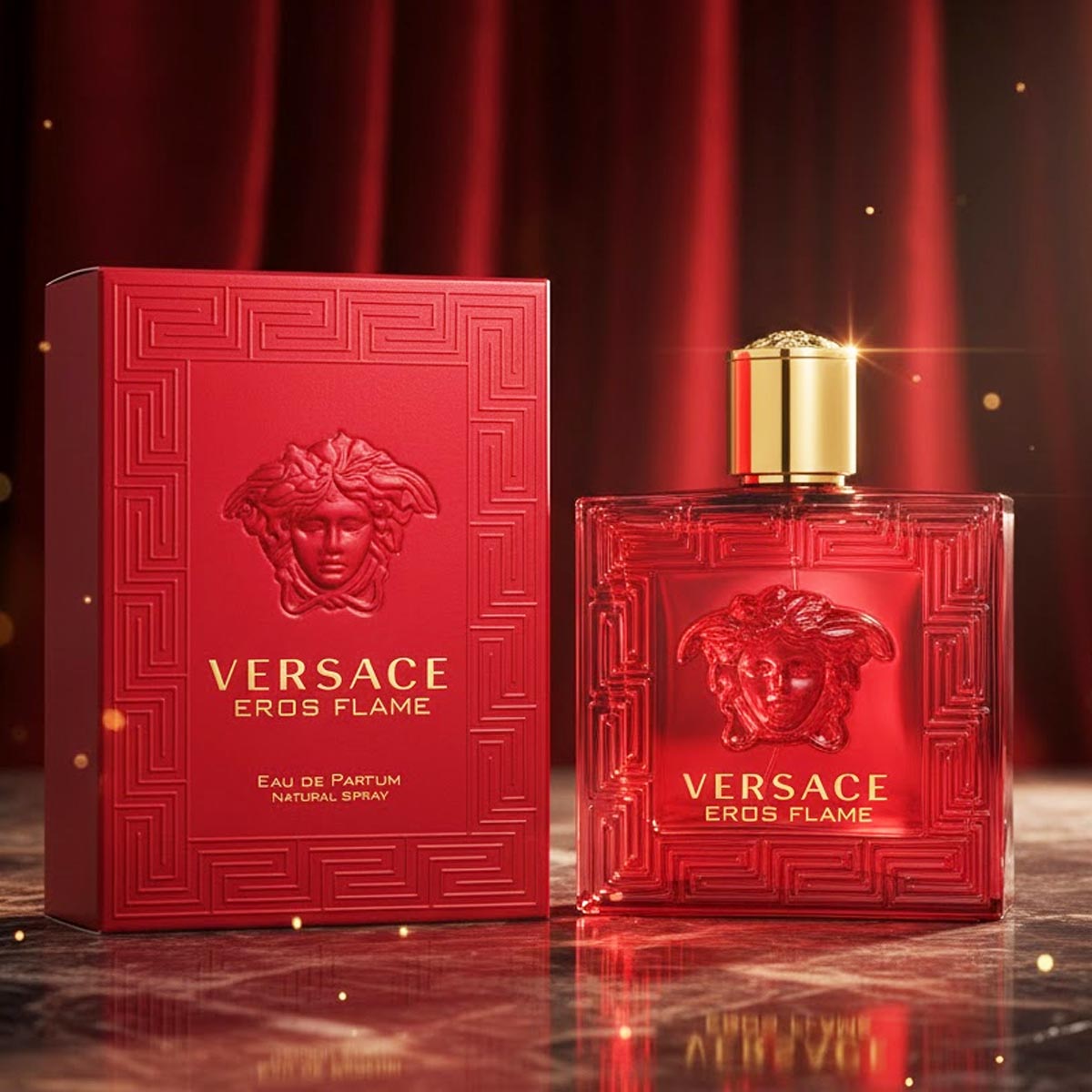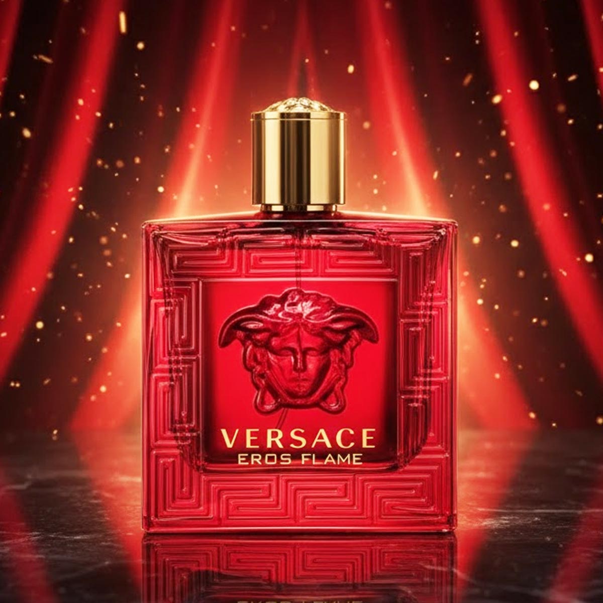 زجاجة حمراء فاخرة مزينة بنقوش هندسية وشعار ميدوسا الذهبي، تعكس طابع العطر الناري والجريء، مع تغليف ملكي بنفس الطابع.