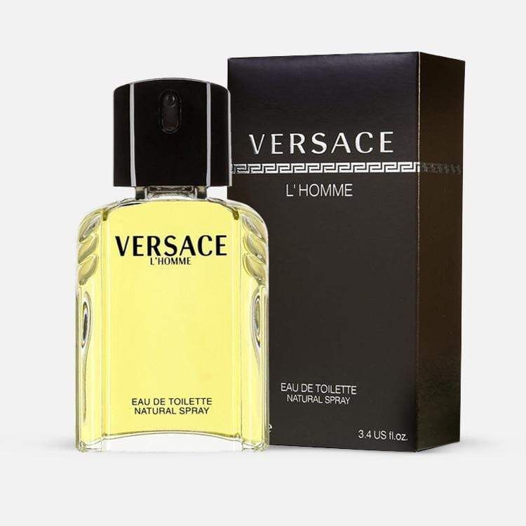 زجاجة بسيطة أنيقة بسائل عطري ذهبي، تحمل شعار Versace L’Homme، مع تغليف كلاسيكي يعكس طابع العطر الرجولي الأصيل.
