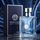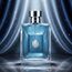 زجاجة زرقاء شفافة بتصميم مستطيل أنيق، مزينة بشعار ميدوسا الفضي، مع تغليف داكن يحمل نقوش يونانية كلاسيكية تعكس طابع العطر الفاخر.