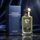 زجاجة شفافة بسائل ذهبي فاتح تحمل شعار ميدوسا، مع غطاء هندسي فاخر، وتغليف أزرق مزين بنجوم يعكس الطابع الحالم للعطر.