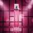 زجاجة طويلة أنيقة بلون وردي مشرق، تعكس روح العطر الحيوية، مع تغليف أبيض يحمل شريطًا ورديًا يعكس اسم العطر وجاذبيته.