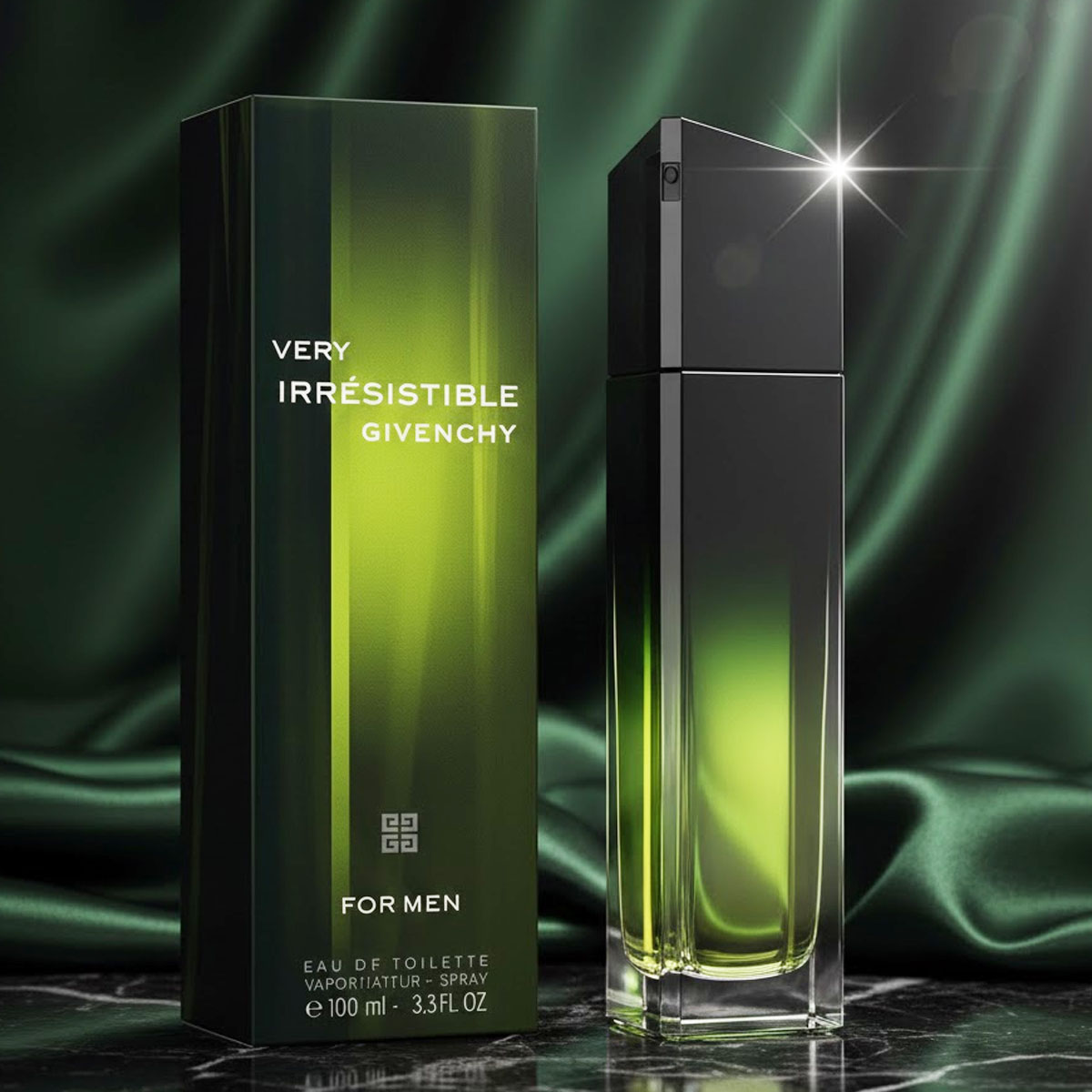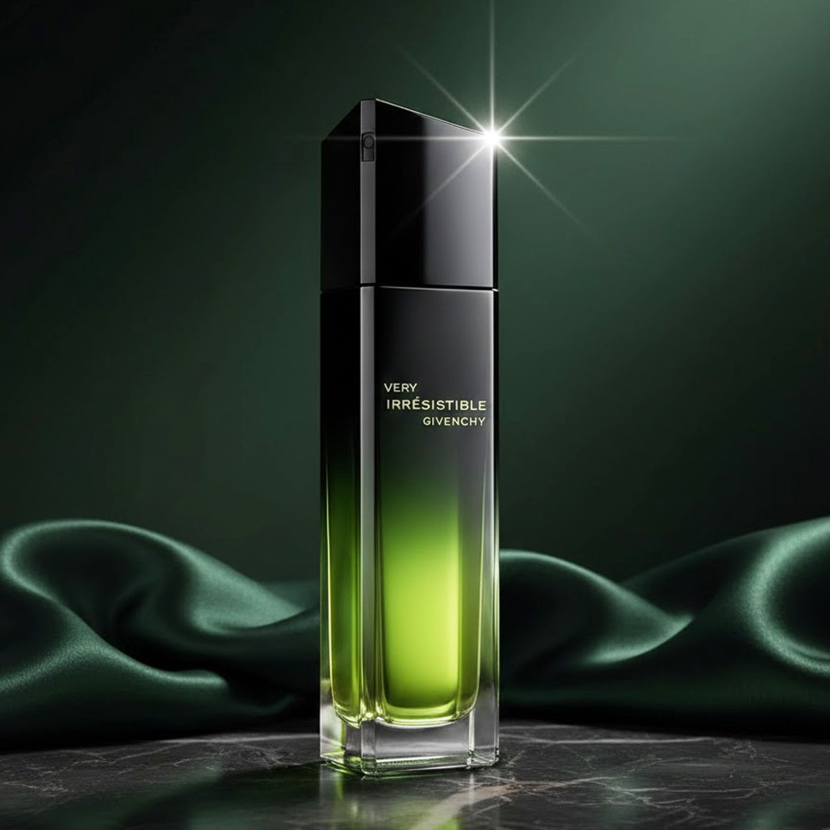 زجاجة شفافة أنيقة تحتوي على سائل أخضر، مع غطاء أسود وتغليف عصري يحمل توقيع Givenchy، يعكس طابع العطر العصري والجذاب.